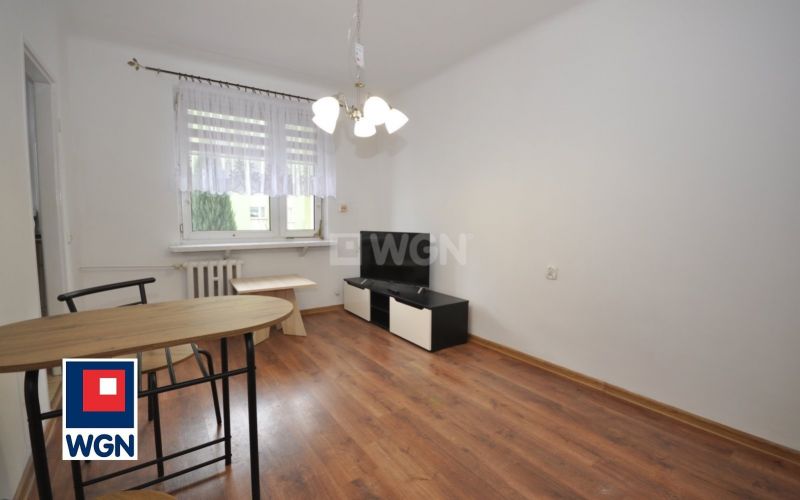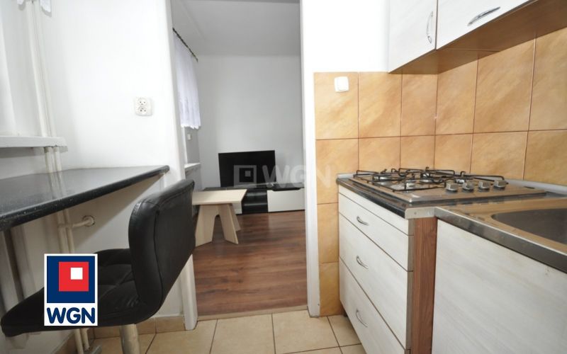 Bardzo silnym punktem mieszkania jest widny pokój (~14,5 m2) z wejściem do kuchni, z miejscem na szafę, szafkę pod telewizor oraz stół z krzesłami. W kuchni znajduje się praktyczna zabudowa kuchenna, zawierająca niezbędny sprzęt AGD w tym zlewozmywak nierdzewny, płyta gazowa, szafki stojące i wiszące, spory blat roboczy oraz miejsce na lodówkę.