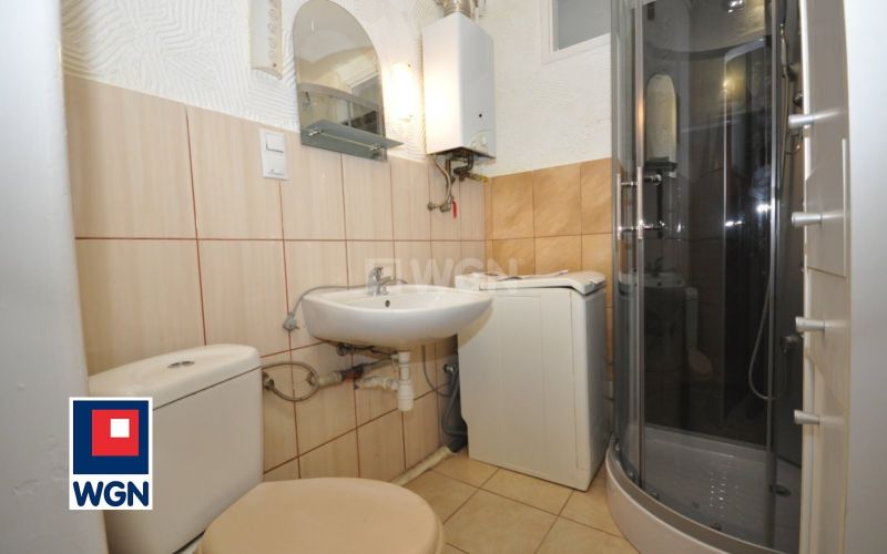 W łazience znajduje się nowa kabina szklana na brodziku akrylowym, umywalka wisząca, kompakt WC oraz pralka. Ściany i podłogi wykończone są higienicznymi płytkami.